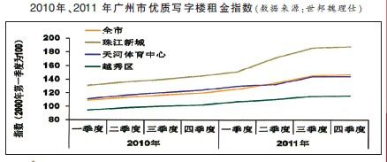 預(yù)警二:新興商圈帶動(dòng)租金下降世邦魏理仕數(shù)據(jù)顯示,2011 年廣州市優(yōu)質(zhì)商鋪?zhàn)饨鸹境史€(wěn)中微降的趨勢,其主要原因是珠江新城和白云新城等新興商圈年內(nèi)有大體量新項(xiàng)目入市。新興商圈項(xiàng)目主要以低租金吸引客戶,拉低了全市平均租金。因此至四季度末,全市整體租金水平均為每天每平方米46.5 元,同比下跌3.1%。相比之下, 同期傳統(tǒng)商圈的租金仍然維持堅(jiān)挺并略有上升,2011 年末天河體育中心商圈租金同比上升6.7%,而北京路和陵園西商圈租金則錄得11.1%的年度漲幅。由此可見, 買鋪收租應(yīng)始終考慮地段的重要因素,不可輕率入市。預(yù)警三:寫字樓空置率將有所上升2011年一手寫字樓成交量持續(xù)增長,天河區(qū)的珠江新城依然是成交量最大的區(qū)域,而外圍區(qū)域蘿崗區(qū)、番禺區(qū)和南沙區(qū)等皆有活躍的表現(xiàn),主要原因是政策扶持、交通通達(dá)度的提高與較低的成交總價(jià)。成交價(jià)格方面,2011 年攀升較大,12 月均價(jià)達(dá)元/平方米,創(chuàng)近兩年新高。據(jù)中原地產(chǎn)數(shù)據(jù)顯示,2011 年廣州市寫字樓租金升幅大約在5%左右, 但年預(yù)計(jì)會(huì)有新增項(xiàng)目持續(xù)入市(特別是珠江新城),所以租金受龐大的新增量壓力影響,難以大幅上升。空置率方面,2011 年廣州市寫字樓空置率有所攀升。即使吸納量在亞運(yùn)后得到攀升,但廣州市有高達(dá)50 多萬平方米的甲級(jí)寫字樓新增面積供應(yīng),空置率全年達(dá),比2010 年增加超過三成。《藍(lán)皮書》預(yù)計(jì),鑒于2012 年新增供應(yīng)檔次偏高, 市場吸納度還不足以應(yīng)對(duì)眾多新增寫字樓,空置率依然會(huì)有上升的趨勢。預(yù)警四:優(yōu)質(zhì)辦公物業(yè)租金或下調(diào)據(jù)世邦魏理仕數(shù)據(jù)顯示,2011 年廣州市優(yōu)質(zhì)寫字樓租賃成交活躍,供需兩旺,且受通脹大環(huán)境影響,平均租金在全年內(nèi)持續(xù)攀升。本年度前三季度租金上漲迅速,其中第二和第三季度更分別錄得環(huán)比7.4%和的增幅,達(dá)近五年來的高位,至四季度由于需求增速下降而租金升幅有所放緩。截至2011 年第四季度,廣州優(yōu)質(zhì)寫字樓的平均租金升至每月每平方米132 元,同比升幅高達(dá)22.5%,已超過金融危機(jī)前的平均租金水平。其中珠江新城四季度優(yōu)質(zhì)寫字樓的租金達(dá)到每月每平方米164 元,同比升30.0%。另外,在2011 年度的新增供應(yīng)中, 甲級(jí)寫字樓供應(yīng)量高達(dá)。甲級(jí)與非甲級(jí)寫字樓的租金差距被逐漸拉大,這一現(xiàn)象反映了當(dāng)前廣州寫字樓的需求面有品質(zhì)化、高端化的趨勢。不過, 隨著廣州甲級(jí)寫字樓與乙級(jí)寫字樓租金差距逐步擴(kuò)大,乙級(jí)寫字樓的租金優(yōu)勢將愈加凸顯, 甲級(jí)寫字樓的租賃成交可能將出現(xiàn)放緩跡象。從中期來看, 當(dāng)大量優(yōu)質(zhì)寫字樓物業(yè)的逐步投入使用, 對(duì)租金的壓力也將逐步體現(xiàn), 優(yōu)質(zhì)辦公物業(yè)租金將可能會(huì)出現(xiàn)下調(diào)。商業(yè)物業(yè)方面,大量的新增供應(yīng)預(yù)料將令優(yōu)質(zhì)商業(yè)物業(yè)租金持續(xù)向下調(diào)整,但由于當(dāng)前的國際服飾品牌以及國內(nèi)大型餐飲租戶的積極擴(kuò)張,相信整體的空置率水平不會(huì)出現(xiàn)大幅增長。