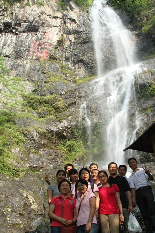 在遠安縣參觀三百山國家森林公園景區里的福鰲塘。青山環抱綠水,綠水映襯青山,一幅和諧的景象。幾度周轉之后,我們終于來到了“東江第一瀑”之稱的-東江瀑布。一股感恩大自然,感恩祖國,對香港同胞飲用水關心的感覺油然而生。