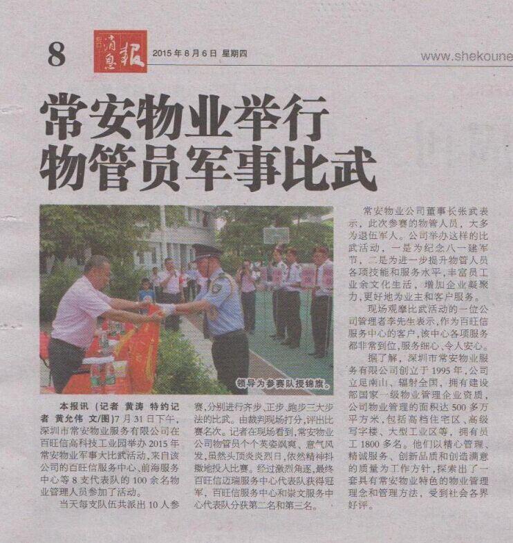 在2015年八一建軍節(jié)即將來(lái)臨之際,公司上下歡聚在百旺信高科技工業(yè)園,舉辦軍事隊(duì)列比武,一方面慶祝中國(guó)人民解放軍建軍88周年,另一方面向大家宣傳強(qiáng)身健體的觀念,同時(shí)向各位業(yè)主展示公司秩序維護(hù)隊(duì)伍的專業(yè)性和可靠性。每個(gè)服務(wù)中心代表隊(duì)都意氣風(fēng)發(fā)、斗志昂揚(yáng),充分展示了自己的實(shí)力,收獲了屬于自己的榮譽(yù)。