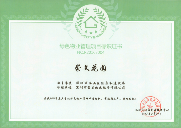 為落實深圳市住建局關于《深圳市綠色物業(yè)管理導則(試行)》指導精神,在保證物業(yè)服務質(zhì)量等基本要求的前提下,通過科學管理、技術改造和行為引導,有效降低各類物業(yè)運行能耗,最大限度地節(jié)約資源和保護環(huán)境,致力構建節(jié)能低碳生活社區(qū)的物業(yè)管理活動,實現(xiàn)城市經(jīng)濟社會可持續(xù)發(fā)展目標,提高物業(yè)管理的科技含量和服務水平。2016年12月,在公司的正確領導和相關部門的積極配合下,通過項目全體員工的共同努力,我司“崇文花園”項目和“邁瑞總部大廈”項目順利通過了深圳市建設科技促進中心的相關評審,分別獲得了“2016年度三星級綠色物業(yè)管理項目”證書和“2016年度一星級綠色物業(yè)管理項目”證書。